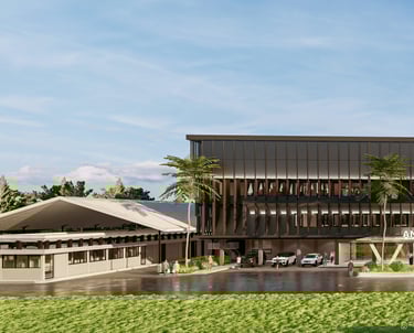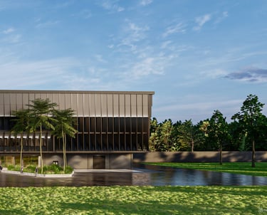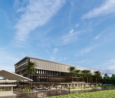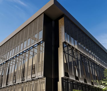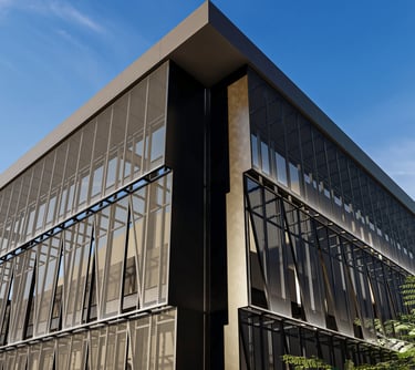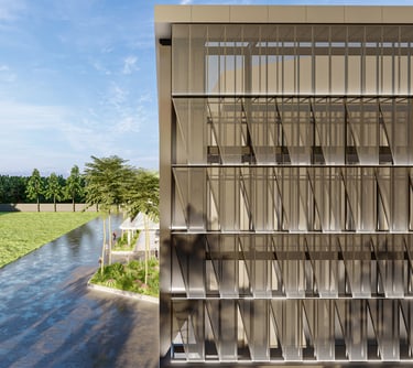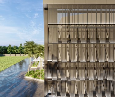 Penggunaan ACP pada fasad memberikan tampilan yang bersih dan elegan, sekaligus memastikan durabilitas dan kemudahan perawatan. Kaca digunakan secara luas untuk memaksimalkan pencahayaan alami, mengurangi ketergantungan pada penerangan buatan, serta memberikan kesan terbuka dan luas. Expanded metal menambah dimensi tekstur dan ketahanan, memberikan elemen visual yang menarik dan modern pada struktur bangunan.