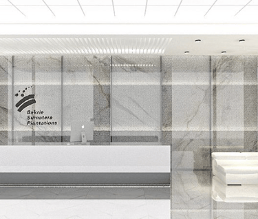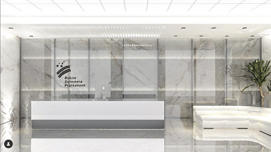 Lobi kantor Bakrie Sumatera Plantation dirancang dengan cermat oleh Markstudios Architect, interior designer Jakarta, yang terkenal dengan keahliannya dalam menciptakan desain yang elegan dan fungsional. Lobi ini menyambut setiap pengunjung dengan suasana yang mewah dan profesional, mencerminkan identitas perusahaan yang kuat. Meja resepsionis yang dilapisi marmer dan dikelilingi oleh dinding kaca menciptakan tampilan yang menawan dan modern. Penggunaan plat besi sebagai aksen menambah kesan tegas dan industri, sementara pencahayaan ambience menambah nuansa hangat dan mengundang.