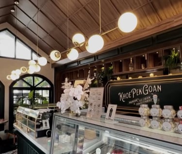Memasuki Khoe Pek Goan Gelato, Anda akan disambut dengan atmosfer yang hangat dan mengundang. Desain interior menggabungkan elemen-elemen kayu yang memberi kesan natural dan hangat. Penggunaan kaca bertekstur menambah dimensi visual yang menarik, memantulkan cahaya secara elegan dan menciptakan ilusi ruang yang lebih luas.
