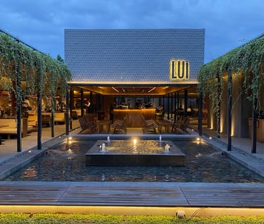 Restoran Lui di Bandung dirancang oleh Markstudios Architect, menggabungkan arsitektur modern dengan elemen tropis. Bangunan ini menggunakan material alami seperti kayu dan batu, dengan jendela besar yang membiarkan cahaya alami masuk.