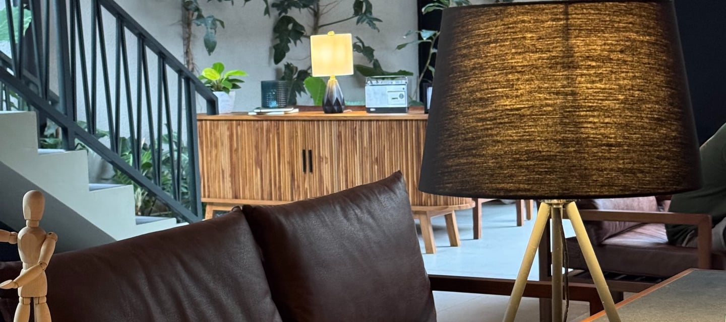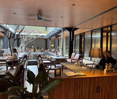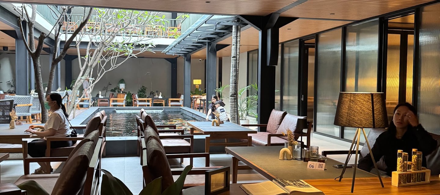 Di tengah area utama terdapat open plan space dengan kolam koi yang menjadi elemen visual dan fungsi mikroklim—menyegarkan lingkungan sekitar dan membantu sirkulasi udara. Interiornya menggunakan furnitur kayu serta tekstur netral hangat yang memunculkan suasana hangat, bersahaja, dan estetis sekaligus. escapesweetest.com